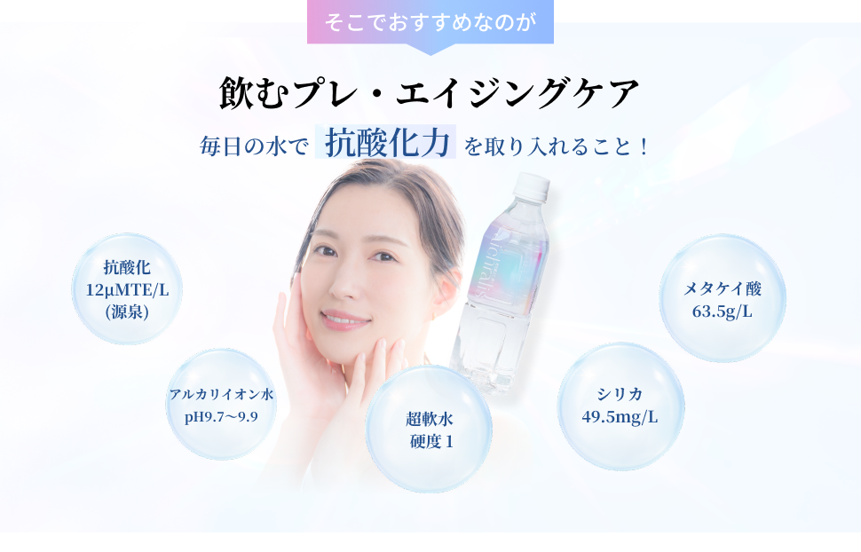 美容にも大きく影響する成分のため、「美のミネラル」と呼ばれることもあります。またシリカは体内で生成ができないため、水や食品など外部から摂取して補うことが良いと言われています。(シリカ 49.5mg/L含有)