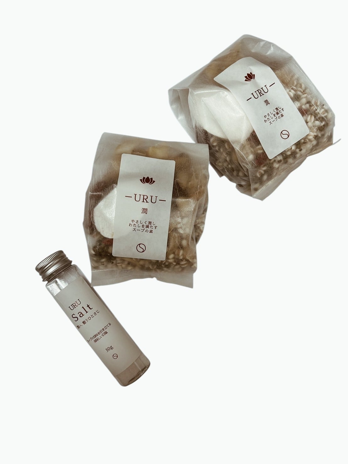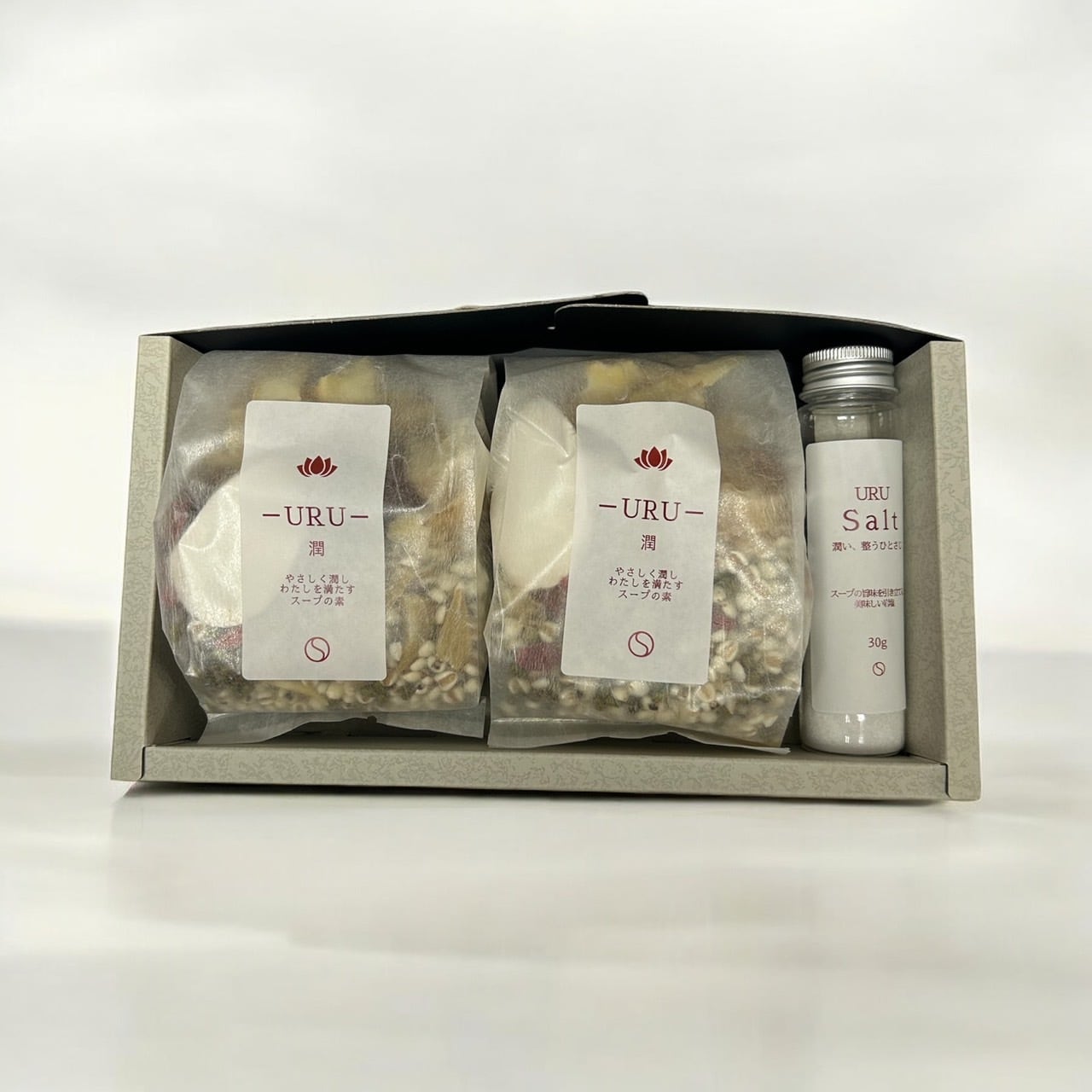 養生スープキット2袋と、その味わいを引き立てるURU Salt(ポーランド産岩塩30g)をオリジナルギフトボックスに詰め合わせました。