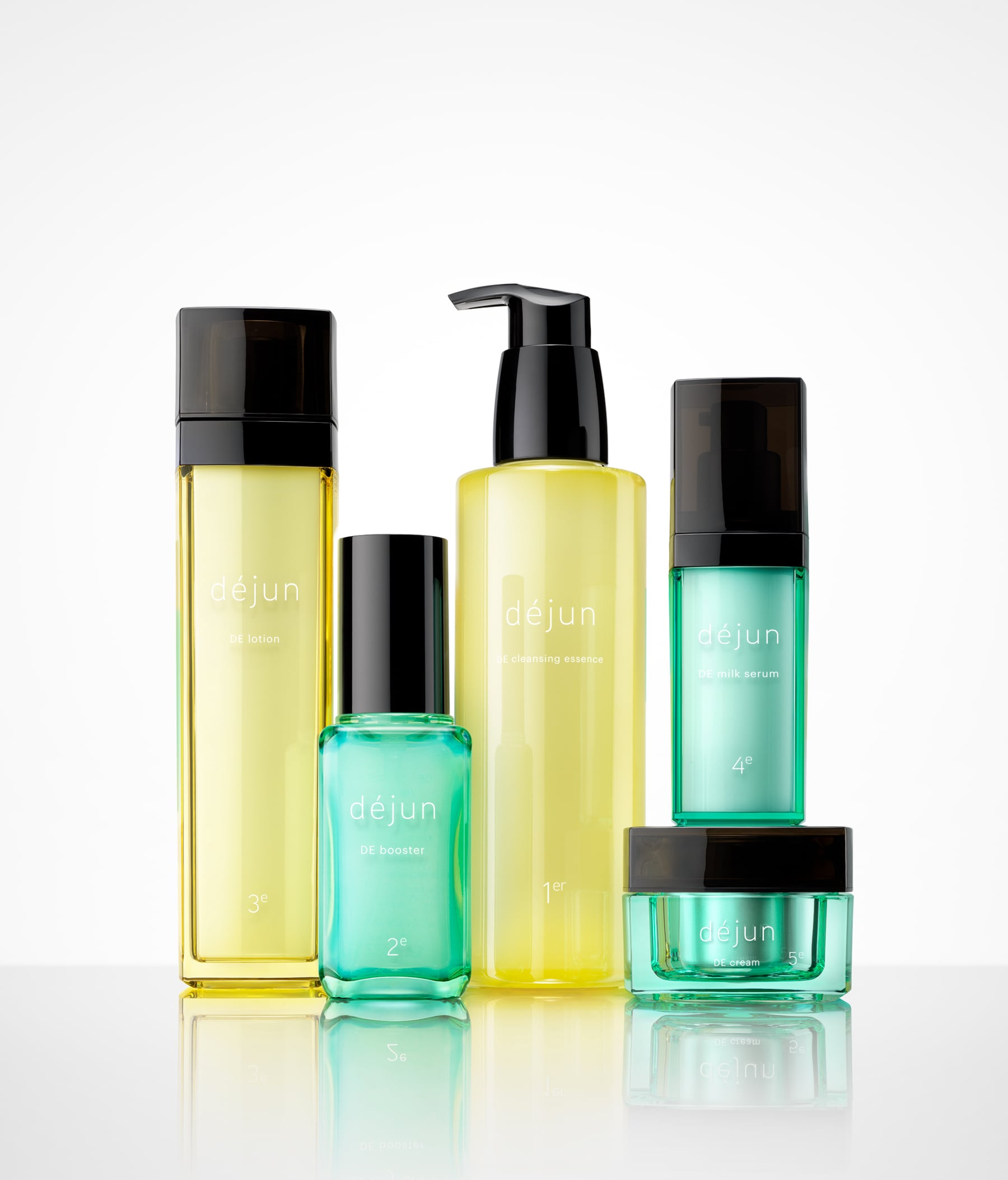 déjun ではDEクレンジングエッセンスでお肌を目覚めさせた後、再生指令の点火剤としてDEブースターをお肌に届けることでさらに次の美容成分の通り道を切り開く設計にこだわりました。